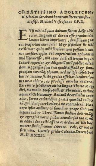 Θωμᾶς Μάγιστρος κ.ἄ. Θωμᾶ τοῦ Μαγίστρου ὀνομάτων ἀττικῶν ἐκλογαί. Φρυνίχου ἐκλογὴ ἀττικῶν ῥημάτων καὶ ὀνομάτων. Μανουήλου τοῦ Μοσχοπούλου ἀττικῶν ὀνομάτων ἐκλογὴ... Τάξις παλαιὰ καὶ ὀνομασίαι τῶν ἀρχόντων ἐκ τοῦ αἰλιανοῦ... [Παρίσι], Michel de Vascosan, Νοέμβριος 1532.