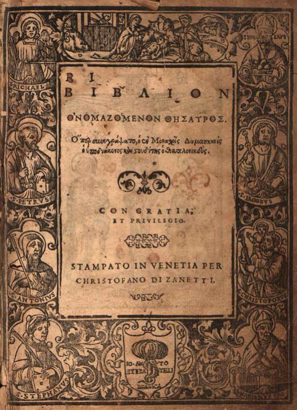 Δαμασκηνὸς Στουδίτης. Βιβλίον ὀνομαζόμενον Θησαυρὸς..., Βενετία, Christofano di Zannetti, 1562.