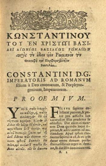 Κωνσταντῖνος Πορφυρογέννητος. Constantini Porphyrogennetae Imperatoris Opera... Ioannes Meursius collegit, coniunxit, edidit..., Λέιντεν, ex officinâ Elzeviriana, 1617.