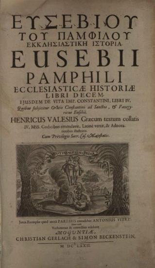 Εὐσέβιος ὁ Καισαρείας, Εὐσεβίου τοῦ Παμφίλου Ἐκκλησιατικὴ Ἱστορία. Eusebii Pamphili Ecclesiasticæ Historiæ libri decem ---, Christian Gerlach & Simon Beckenstein, Moguntia 1672.