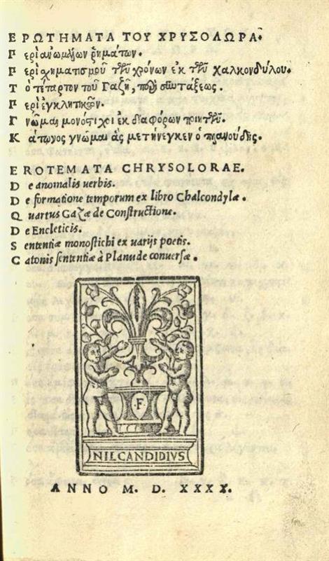 Ἐμμανουὴλ Χρυσολωρᾶς. Ἐρωτήματα τοῦ Χρυσολωρᾶ. Περὶ ἀνωμάλων ῥημάτων. Περὶ σχηματισμοῦ τῶν χρόνων ἐκ τῶν Χαλκοκονδύλου. Τὸ τέταρτον τοῦ Γαζῆ, περὶ συντάξεως. Περὶ ἐγκλητικῶν. Γνῶμαι μονόστιχοι ἐκ διαφόρων ποιητῶν. Κάτωνος γνῶμαι ἃς μετήνεγκεν ὁ πλανούδης, Φλωρεντία, Benedicto Giunta, Ἰανουάριος 1540.