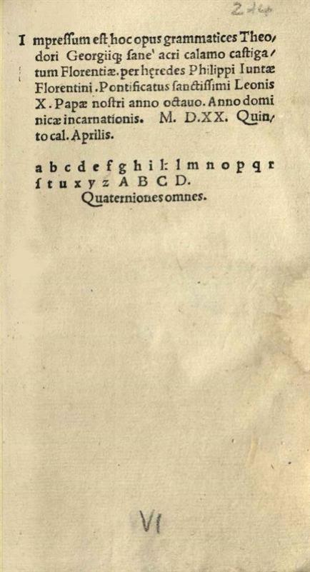 Θεόδωρος Γαζῆς. Θεοδώρου Γραμματικῆς Εἰσαγωγῆς Βιβλία Δ´..., Φλωρεντία, per hearedes Philippi Iuntae, Ἀπρίλιος 1520.
