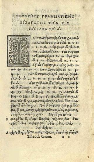 Θεόδωρος Γαζῆς. Θεοδώρου Γραμματικῆς Βιβλία Δ´. Περὶ μηνῶν... Γεωργίου Λεκαπηνοῦ περὶ συντάξεως ῥημάτων. Ἐμμανουὴλ Μοσχοπούλου περὶ τῆς τῶν ὀνομάτων καὶ ῥημάτων συντάξεως... περὶ προσῳδιῶν. Ἡφαιστίωνος ἐγχειρίδιον, Φλωρεντία, per haeredes Philippi Iuntae, Ἀπρίλιος 1526.