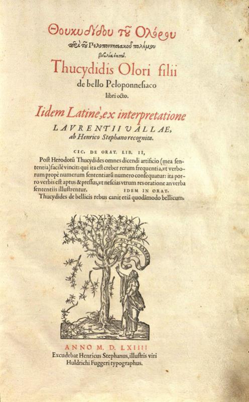 Θουκυδίδης, Θουκυδίδου τοῦ Ὀλόρου Περὶ τοῦ Πελοποννησιακοῦ πολέμου Βιβλία ὀκτώ. Thucydidis Olorii filii de bello Peloponnesiaco libri octo --- inetrpretatione Laurentii Valae, ab Henrico Stephano recognita..., Henricus Stephanus, [Γενεύη] 1564.