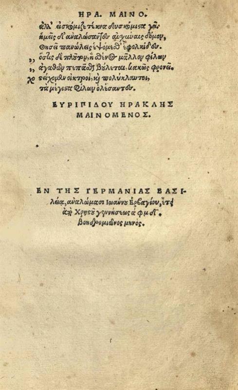 Εὐριπίδης. Εὐριπίδου Τραγῳδίαι ὀκτωκαίδεκα..., Βασιλεία, Ioannes Hervagius, Σεπτέμβριος 1544.