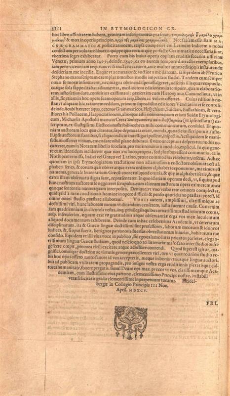Ἐτυμολογικὸν τὸ Μέγα. Ἤγουν Ἡ Μεγάλη Γραμματική... [Ἔκδοση μὲ τὴν ἐπιμέλεια τοῦ Fridericus Sylburgius] [Χαϊδελβέργη], Hieronymus Commelinus, 1594.