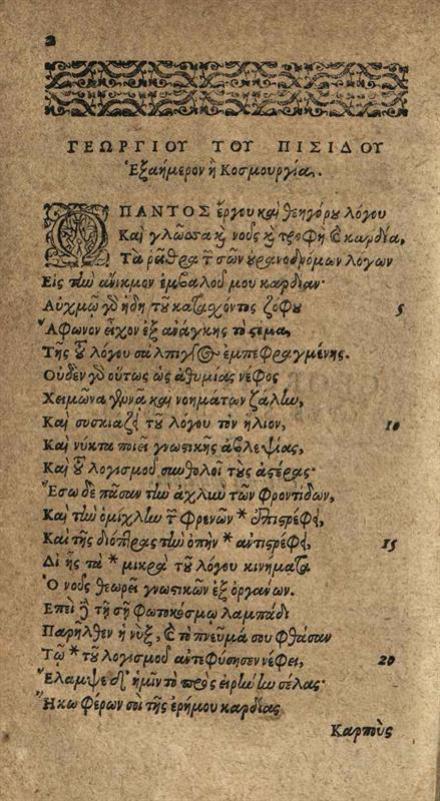 Γεώργιος Πισίδης. Ἑξαήμερον ἤτοι Κοσμογονία... Ἰαμβεῖα εἰς τὸν μάταιον βίον... [Χαϊδελβέργη], Hieronymus Commelinus, 1596.