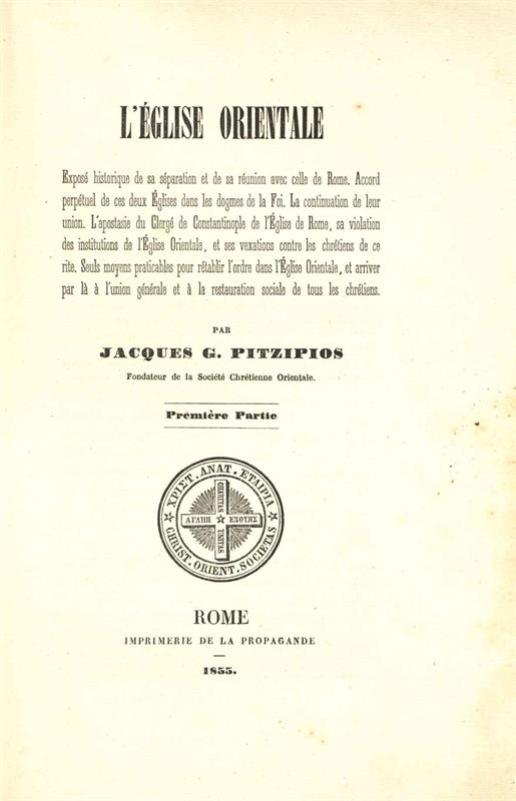 Ἰάκωβος Γ. Πιτζιπιός [Jacques G. Pitzipios], L Église orientale, exposé historique de sa séparation et de sa reunion avec celle de Rome..., Ρώμη, Imprimerie de la Propagande, 1855.