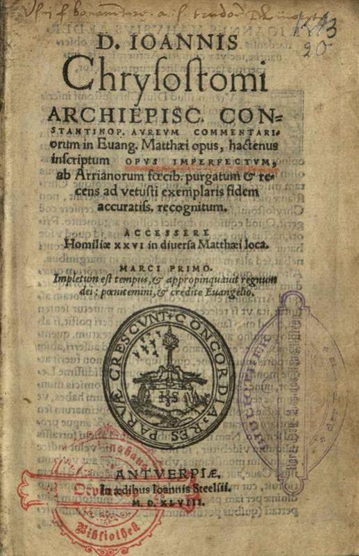 Ἰωάννης ὁ Χρυσόστομος. D. Ioannis Chrysostomi... Aureum Commentarium in Euang. Matthaei opus, hactenus inscriptum..., Ἀμβέρσα, in aedibus Ioannis Steelsii, 1548.