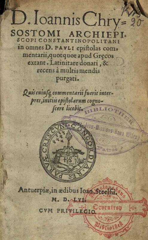 Ἰωάννης ὁ Χρυσόστομος. D. Ioan. Chrysostomi... in omnes D. Pauli epistolas commentarii..., Ἀμβέρσα, in aedibus Ioannis Steelsii, 1556.