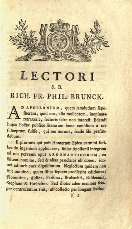Ἀπολλώνιος ὁ Ρόδιος. Apollonii Rhodii Argonautica... emendate edidit Rich. Fr. Phil. Brunk..., Στρασβοῦργο, Johann Geoffroy Bauer et Johann-George Treuttel, 21 Αὐγούστου, 1780.