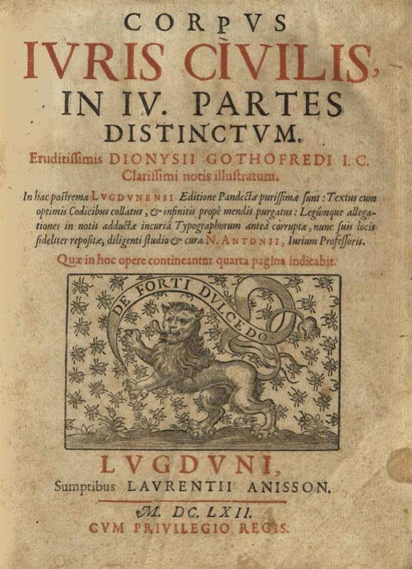 Dionysius Gothofredus. Corpus Iuris Civilis, 2 τόμ., Λυών, Laurentius Anisson, 1662.