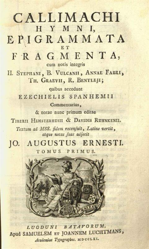 Καλλίμαχος, Callimachi Hymni, Epigrammata et Fragmenta --- recensuit --- Jo. Augustus Ernesti ---, Leiden, Apud Samuelem et Joannem Luchtmans, τ. Ι-II, 1761.