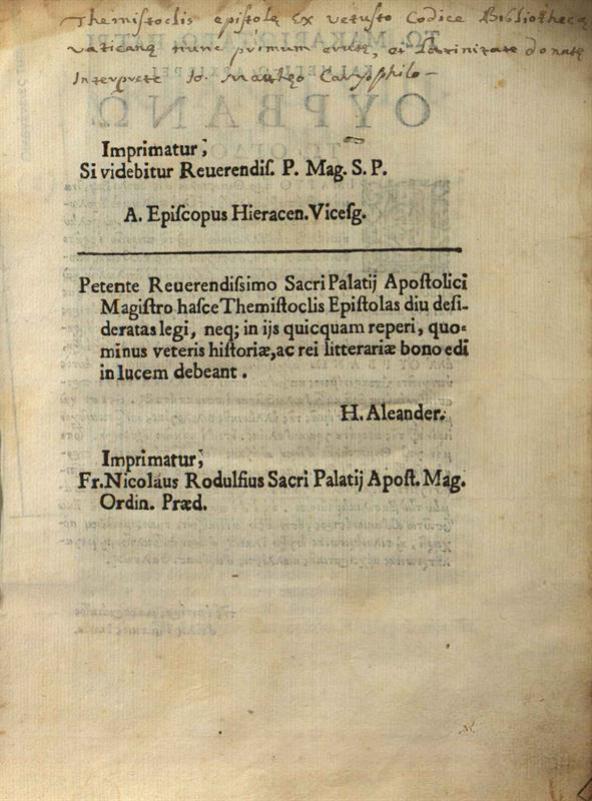 Θεμιστοκλῆς. Themistoclis Epistolae ex Vetusto Codice Bibliothecae Vaticana nunc primum erutae e latinitate... Interprete Io. Matthaeo Caryophilo..., Ρώμη, Ludovicus Grignanus, 1626.