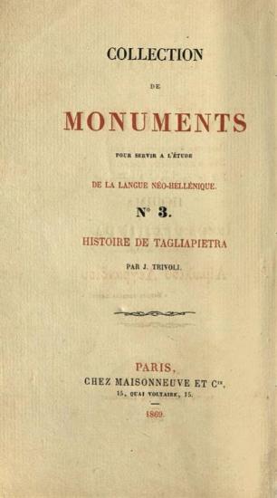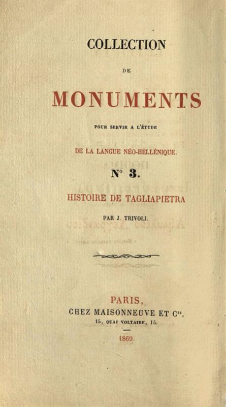 Ἰάκωβος Τριβώλης. Collection de Monuments... No 3. Histoire de Tagliapietra... / Ἱστορία τοῦ Ταγιαπιέρα... ἐπιμελείᾳ τε καὶ διορθώσει Αἰμυλίου Λεγρανδίου [Ém. Legrand]..., Παρίσι, Maison neuve / Ἀθήνα, Γραφεῖο τῆς Πανδώρας, 1869.