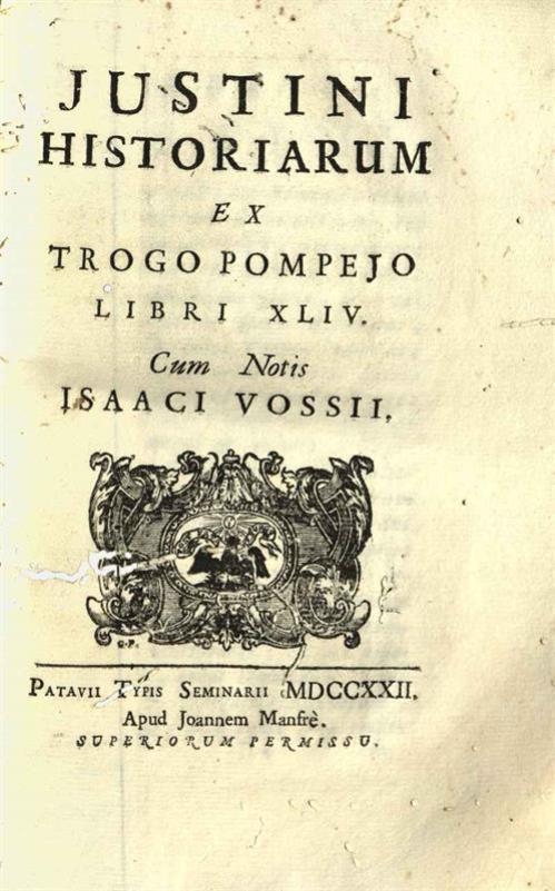 Marcus Iunianus Iustinus. Iustini Historiarum ex Trogo Pompeio Libri XLVI. Cum Notis Isaac Vossii..., Πάντοβα, Typis Seminarii, Joannes Manfrè, 1722.