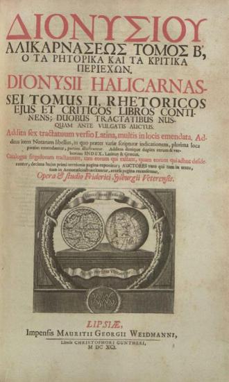 Διονύσιος Ἁλικαρνασσεύς. Τὰ Εὑρισκόμενα Ἱστορικά τε καὶ Ρητορικὰ Συγγράμματα, Λειψία, Mauritius Georgius Weidmann, 1691.