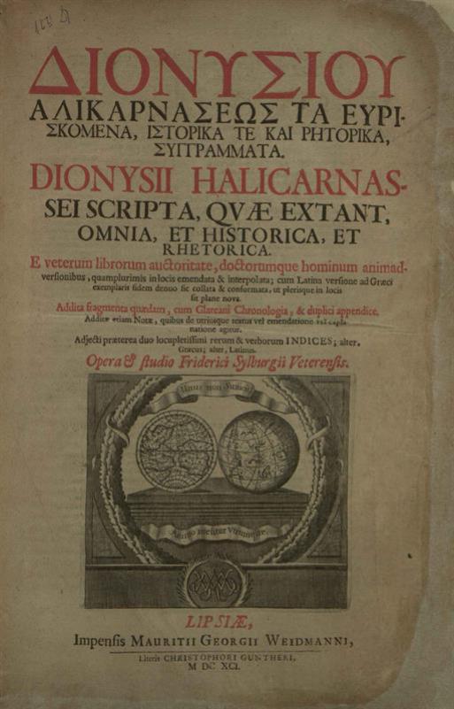 Διονύσιος Ἁλικαρνασσεύς. Τὰ Εὑρισκόμενα Ἱστορικά τε καὶ Ρητορικὰ Συγγράμματα, Λειψία, Mauritius Georgius Weidmann, 1691.