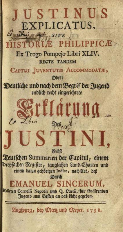 Marcus Iunianus Iustinus. Explicatus sive Historiae Philippicae... Erklärung Des Justini... Emanuel Sincerum, Vugspurg, Merk und Mener, 1758.