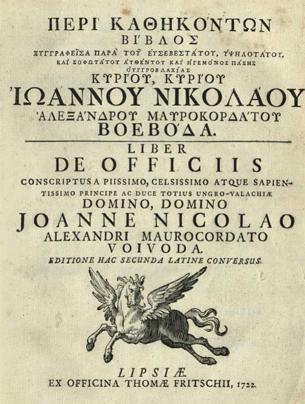 Νικόλαος Μαυροκορδάτος. Περὶ τῶν Καθηκόντων Βίβλος.., Λειψία, ex officina Thomae Fritschii/Joh. Georg. Schneider, 1722.