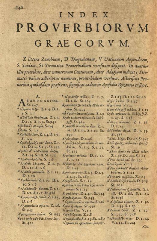 Ζηνόβιος (Ζηνόδοτος). Παροιμίαι Ἑλληνικαί, Ἀμβέρσα, ex officina Plantiniana, apud viduam & Filios Ioannes Moreti, 1612.