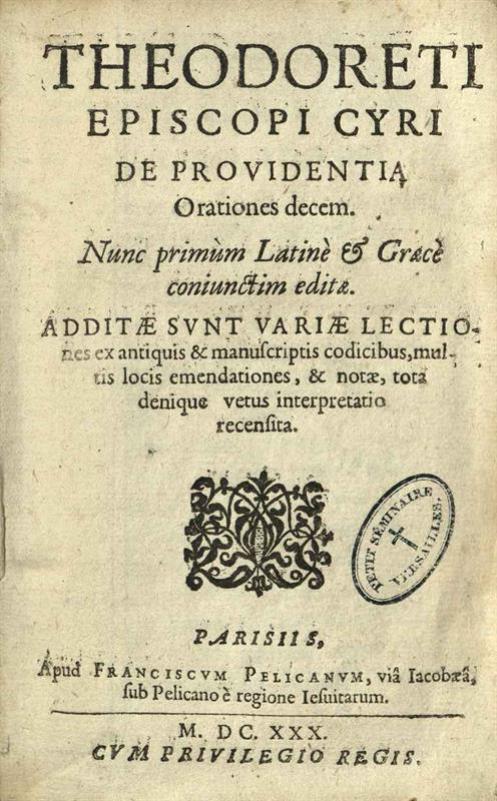 Θεοδώρητος. Theodoreti Episcopi Cyri De Providentia Orationes decem. Nunc primum Latinè & Gracè coniunctim edite..., Παρίσι, apud Franciscum Pelicanum, 1630.