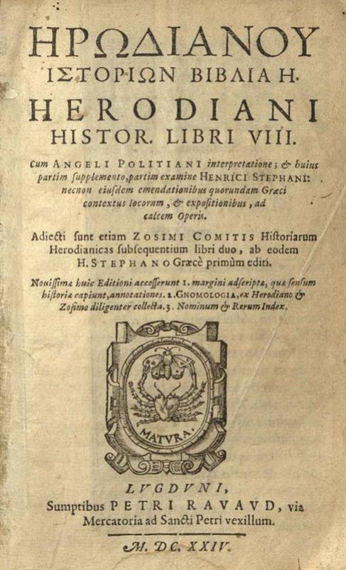 Ἡρωδιανός. Ἡρωδιανοῦ Ἱστοριῶν Βιβλία..., Cum Angeli Politiani interpretatione... Hnerici Stephani... Zosimi Comitis Historiarum Herodianicas subsequentium libri duo..., Λυών, Petrus Ravaud, 1624.