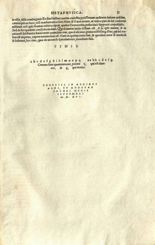 Βησσαρίων, Quae hoc in volumine tractantur Bessarionis Cardinalis Niceni, et Patriarchae Constantinopolitani in calumniatore Platonis --- Eiusdem correctio librorum Platonis de legibus Georgio Trapezuntio interprete --- Eiusdem de natura et arte --- Eiusdem Metaphysicorum Aristotelis XIII librorum tralatio. Theoprasti Metaphysicorum lib. I. Index eorum omnium ---, Βενετία, In aedibus Aldi, et Andreae soceri, Σεπτέμβριος 1516.