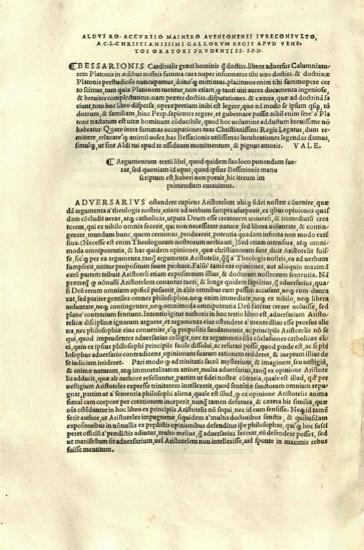 Βησσαρίων, Quae hoc in volumine tractantur Bessarionis Cardinalis Niceni, et Patriarchae Constantinopolitani in calumniatore Platonis --- Eiusdem correctio librorum Platonis de legibus Georgio Trapezuntio interprete --- Eiusdem de natura et arte --- Eiusdem Metaphysicorum Aristotelis XIII librorum tralatio. Theoprasti Metaphysicorum lib. I. Index eorum omnium ---, Βενετία, In aedibus Aldi, et Andreae soceri, Σεπτέμβριος 1516.