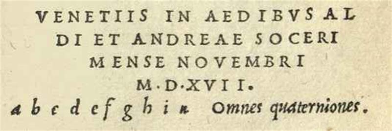 Μουσαῖος. Μουσαίου ποιημάτιον τὰ καθ᾽ Ἡρὼ καὶ Λέανδρον. Ὀρφέως ἀργοναυτικά. Τοῦ αὐτοῦ ὕμνοι. Ὀρφεὺς περὶ λίθων..., Βενετία, in aedibus Aldi et Andreae Soceri, 1517.