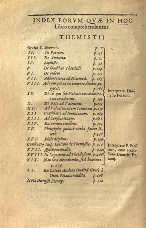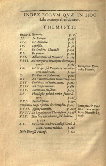 Θεμίστιος. Θεμιστίου Εὐφραδοῦς Λόγοι ΙΘ, Dionysius Petavius... recensuit..., Παρίσι, Michael Sonnius, 1618.