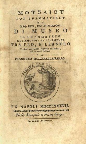 Μουσαῖος. Μουσαίου τοῦ Γραμματικοῦ Τὰ καθ᾽ Ἡρὼ καὶ Λέανδρον..., Gli amorosi avvenimenti Fra Ero, e Leandro, tradotti... da Francesco Mazzarella-Farao..., Νάπολη, Stamperia Pietro Perger, 1787.