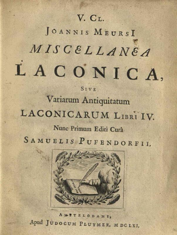 Ioannes Meursius. V. Cl. Ioannis Meursi Miscellanea Laconica... Curâ Samuelis Pufendorfii..., Ἄμστερνταμ, Judocus Pluymer, 1661.