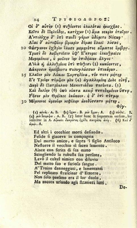 Τρυφιόδωρος. Τρυφιοδώρου Αἰγυπτίου τοῦ Γραμματικοῦ Ἰλίου Ἅλωσις. Interpretatio Italica Ant. Mar. Salvini..., Φλωρεντία, Typis Caesareis, 1765.