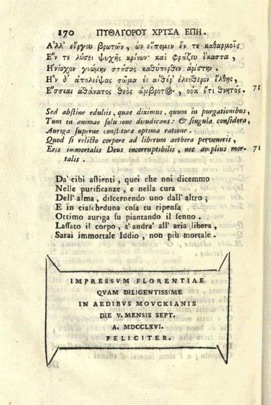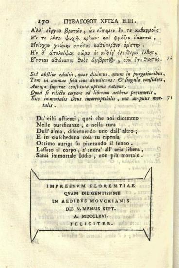 Θέογνις. Θεόγνιδος Μεγαρέως Γνῶμαι, Φωκυλίδου Ποίημα νουθετικόν, Πυθαγόρου Χρυσᾶ Ἔπη..., accedit italica versio metrica curante Ang. Mar. Bandinio I.V.D...., Φλωρεντία, Typis Mouckianis, Σεπτέμβριος 1766.