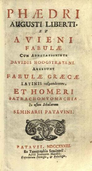 Φαῖδρος. Phaidri Augusti Liberti et Avieni Fabulae cum annotationibus Davidis Hoogstratani. Accedunt Fabulae Graece... Homeris Batrachomyomachia..., Πάντοβα, ex Typographia Seminarii, Joannes Manfrè, 1733.