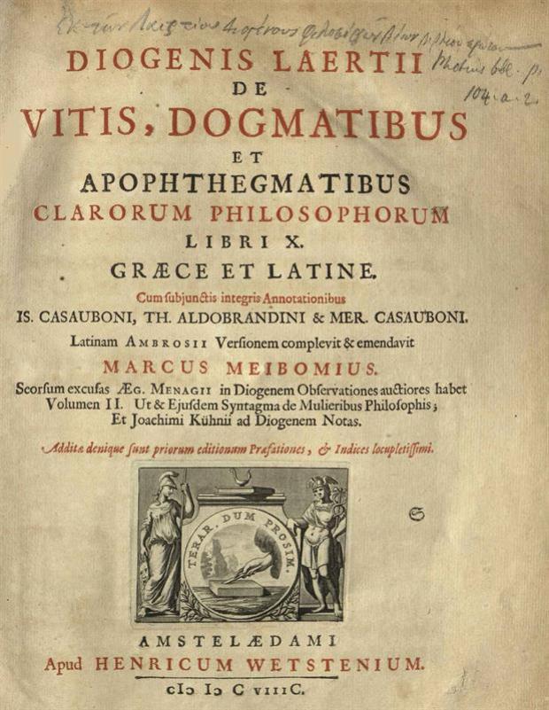 Διογένης Λαέρτιος. De Vitis, Dogmatibus et Apophtegmatibus Clarorum Philosophorum, Ἄμστερνταμ, Henricus Wetsteninus, 1698.