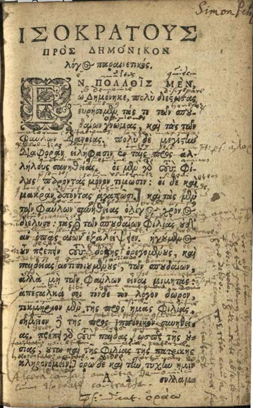 Πλούταρχος - Ἰσοκράτης. Plutarchi Chaeronei Opusculum de liberorum institutione... Isocratis Orationes Tres: I. Ad Demonicum. II. Ad Nicoclem. III. Nicolis..., Wittenberg, Zacharias Lehmann, 1593.