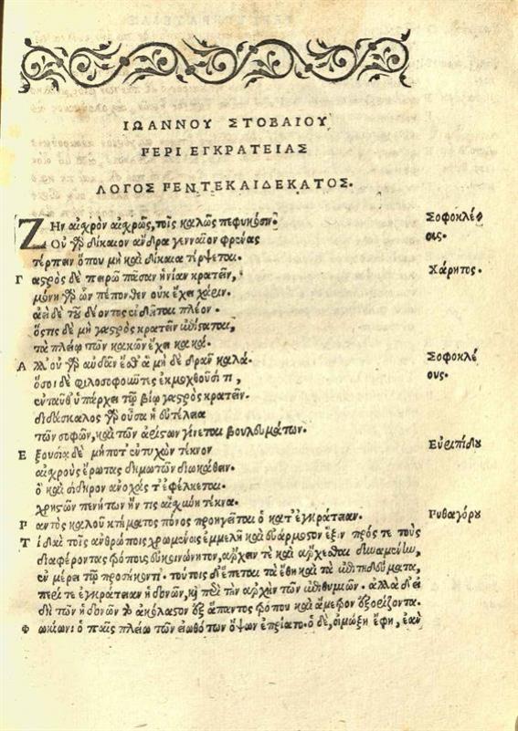 Ἰωάννης Στοβαῖος. Ἰωάννου τοῦ Στοβαίου Ἐκλογαὶ Ἀποφθεγμάτων..., ἔκδοση, Giovanni Francesco Trincavelli, Βενετία, Bartholomeo Zannetti, 1536.