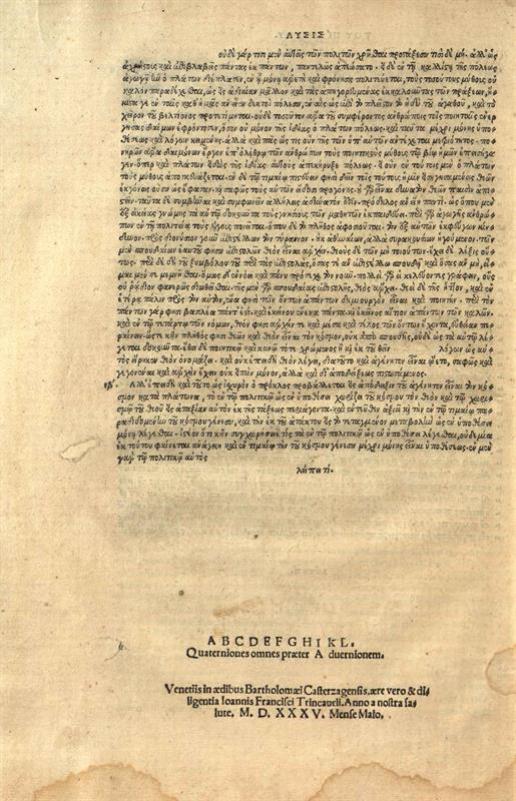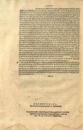 Ἰωάννης Γραμματικός (Φιλόπονος). Ἰωάννου Γραμματικοῦ Ἀλεξανδρέως τοῦ Φιλοπόνου κατὰ Πρόκλου περὶ Αἰδιότητος Κόσμου, Βενετία, Bartholomeo Zannetti, Μάιος 1535.