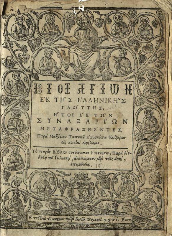 Μάξιμος Μαργούνιος. Βίοι Ἁγίων... ἐκ τῶν Συναξαρίων μεταφρασθέντες..., Βενετία, Ἀνδρέας Ἰουλιανός, 1685.