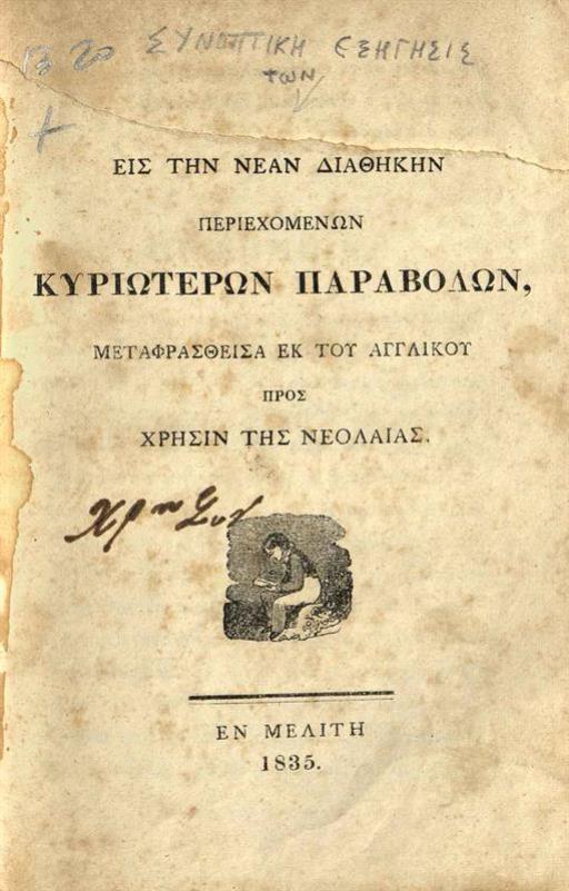 Συνοπτικὴ Ἐξήγησις τῶν εἰς τὴν Νέαν Διαθήκην... κυριωτέρων Παραβολῶν, μεταφρασθεῖσα ἐκ τοῦ ἀγγλικοῦ..., Μάλτα, 1835.