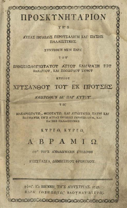 Χρύσανθος ἐκ Προύσης. Προσκυνητάριον τῆς ἁγίας πόλεως Ἱερουσαλὴμ καὶ πάσης Παλαιστίνης..., Βιέννη, Ἰωσὴφ Βαουμάιστερ, 1787.