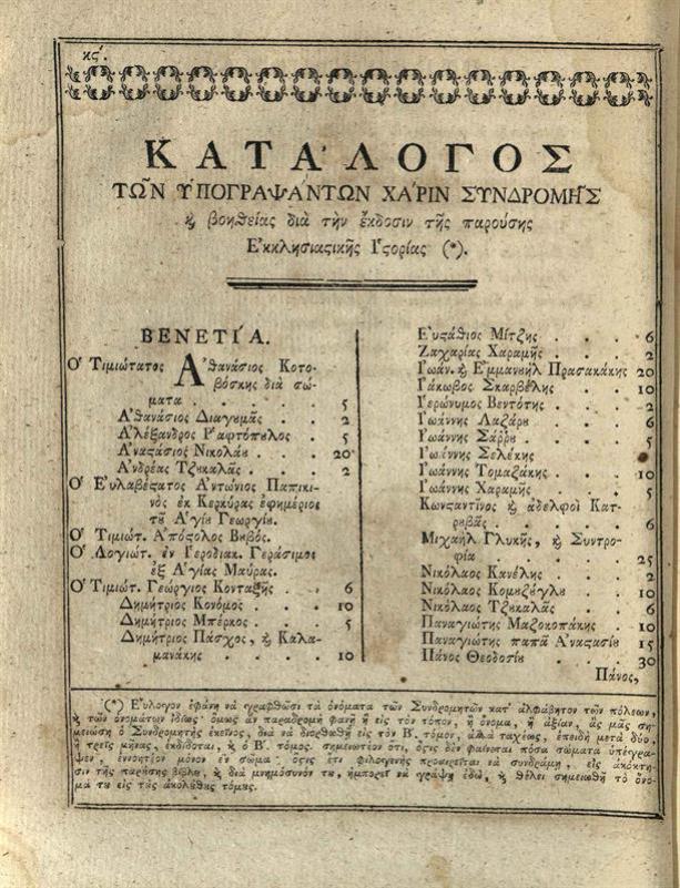 Μελέτιος, Μητροπολίτης Ἀθηνῶν [= Μιχαὴλ Μῆτρος]. Ἐκκλησιαστικὴ Ἱστορία... μετενεχθεῖσα... εἰς... ἁπλοελληνικὴν... παρὰ Γεωργίου Βενδότη..., Βιέννη, Ἰώσηπος Βαουμεΐστερος, τ. Α´, Β´, 1783, τ. Γ´, 1784, Βιέννη, Γεώργιος Βενδότης, τ. Δ´ (Προσθήκη τῆς Ἐκκλησιαστικῆς Ἱστορίας Μελετίου... ἐρανισθεῖσα... παρὰ Γεωργίου Βενδότη), 1795.
