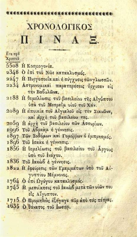 Σολομῶν Νικολαΐδης Κύπριος. Χρονολογικὸς Πίναξ. Περιέχων ἐν βραχυλογίᾳ τὰ πλέον ἄξια λόγου καὶ μνήμης συμβάντα τοῦ Κόσμου.., Αἴγινα, Βασιλικὴ Τυπογραφία, διευθυνομένη ὑπὸ Π. Πατρικίου, 1833.