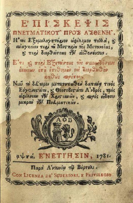 [Μεθόδιος Ἀνθρακίτης]. Ἐπίσκεψις πνευματικοῦ πρὸς ἀσθενῆ. Ἤτοι Ἐξομολογητάριον..., Βενετία, Ἀντώνιος Βόρτολις, 1781.