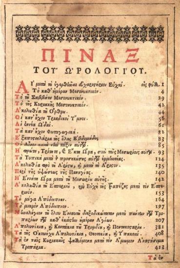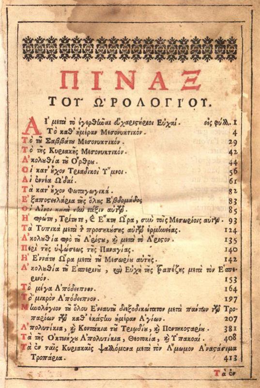 Ὡρολόγιον νεωστὶ μετατυπωθὲν Δι᾽ ἀναλωμάτων --- Ἰωάννου Κωνσταντίνου Βασσαράβα ---, Βενετία, Ἀντώνιος Βόρτολης, 1714.