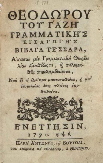 Θεόδωρος Γαζῆς. Θεοδώρου τοῦ Γαζῆ Γραμματικῆς Εἰσαγωγῆς βιβλία τέσσαρα, Ἅπασαν μὲν Γραμματικὴν Θεωρίαν λίαν ἀμεθόδως τε, καὶ πολυμαθῶς..., Βενετία, Ἀντώνιος Βόρτολις, 1770.