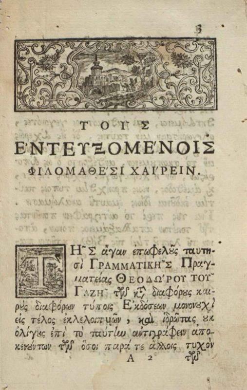 Θεόδωρος Γαζῆς. Θεοδώρου τοῦ Γαζῆ Γραμματικῆς Εἰσαγωγῆς βιβλία τέσσαρα, Ἅπασαν μὲν Γραμματικὴν Θεωρίαν λίαν ἀμεθόδως τε, καὶ πολυμαθῶς..., Βενετία, Ἀντώνιος Βόρτολις, 1770.