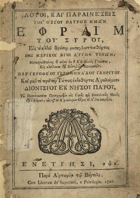 Ἐφραὶμ ὁ Σύρος. Λόγοι καὶ παραινέσεις... μεταγλωττισθέντες παρ᾽ Ἱεροθέου Ἱερομονάχου Ἰβηρίτου..., Βενετία, Ἀντώνιος Βόρτολις, 1720.